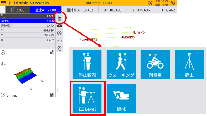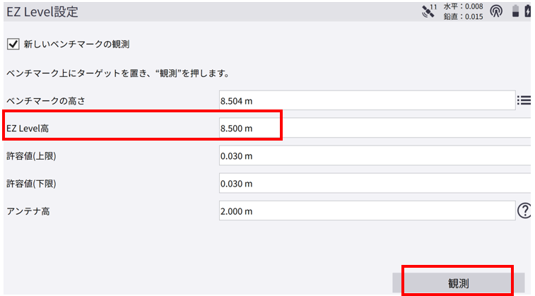 3.EZ Level高(設計面の高さ)を入力し、<観測>を選択します。