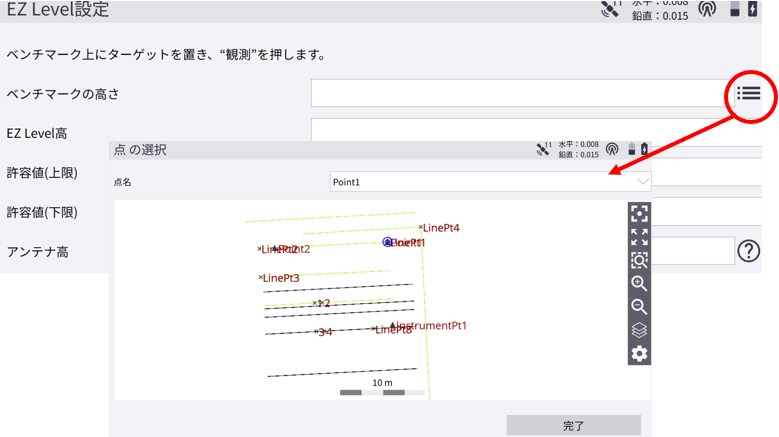 2.使用するベンチマークを選択して<完了>選択します。ベンチマーク上に移動局を置きます。