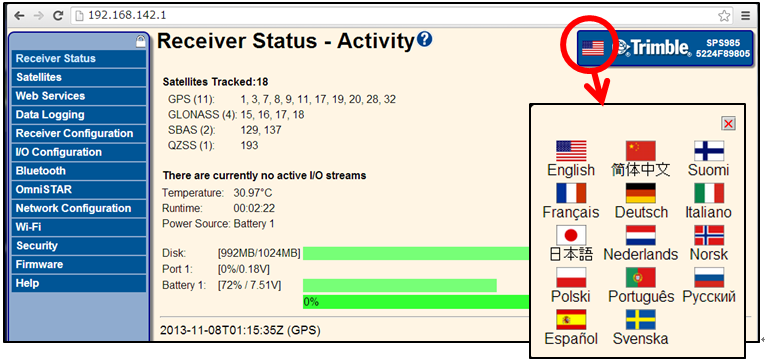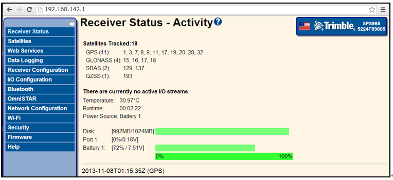 6.インターネットエクスプローラなどのブラウザを開き、アドレスに[192.168.142.1]と入力します。GNSS受信機のブラウザ画面が表示されます。パスワードの入力が求められた場合は、Username:admin、Password:password と入力してください。