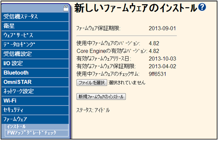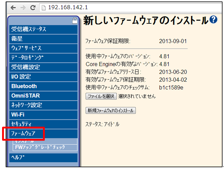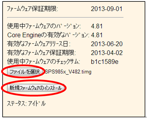 8.<ファイルを選択>を選択、FWファイルを指定して<新規ファームウェアのインストール>を選択します。