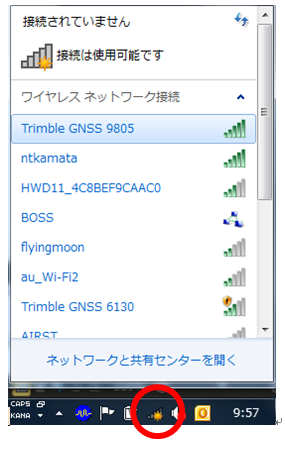3.PC右下のWi-Fiアイコンを選択し、Trimble GNSS xxxx(シリアル下4ケタ)が表示されていることを確認します。