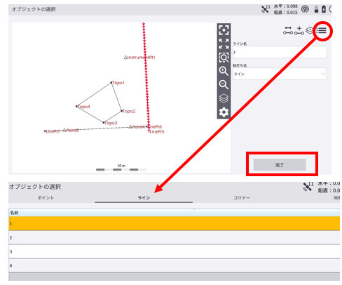 2.画面上のラインを選択するか、ラインリストから選択して<完了>を選択して下さい。