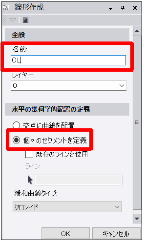 7) <平面線形オプション>の<緩和曲線部入力モード:>を<長さ基準に>に変更します。