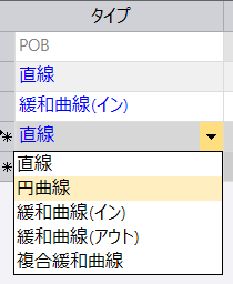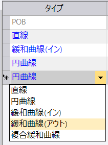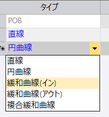 4) 卵型クロソイド部分の要素を入力します。 要素のタイプにて<複合緩和曲線>を選択します。