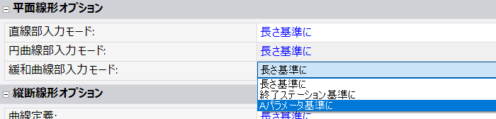3) <平面線形オプション>の<緩和曲線部入力モード:>を<Aパラメータ基準>に変更し、線形計算書などからパラメータを入力するモードに変更します。
