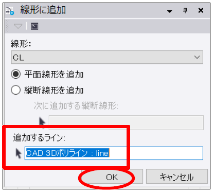 5) <追加するライン>にて平面線形作成に使用するラインを選択して、<OK>を選択します。