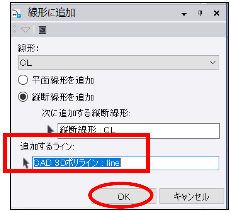 11) <追加するライン>にて縦断線形作成に使用するラインを選択して、<OK>を選択します。
