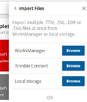 Trimble Connect プロジェクトを探索し、そこから特定の適用可能なファイル タイプ (.dxf、.tiff、.ttm) をインポートして WorksOS で使用できるようになりました。