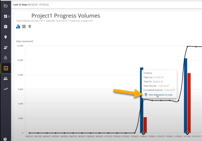 機械数 - リンクをクリックすると、機械の名前の貢献機械ペインが開きます。これにより、ある日が他の日よりも生産性が高い理由を理解するのに役立ちます。この機能を使用すると、特定の日にグラフ内の作業が行われた場所を簡単に確認できます。進捗土量表示は動的であるため、異なる日付のフィルターを適用すると、マップが更新されます。