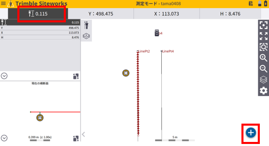 3.受信機を観測点に移動、または観測点のターゲットを視準し測標高を確認後、<+>を選択します。