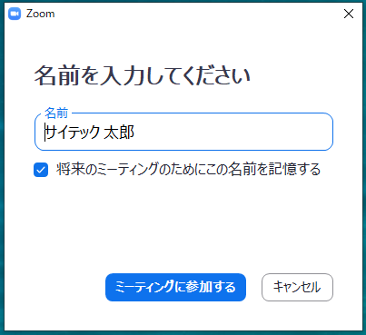 | 3. インストールが完了すると、名前を入力する欄が表示されます。お名前を入力後、青いボタン「ミーティングに参加する」をクリックします。 | |