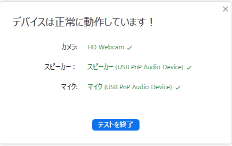 | 7. すべて確認が終了すると右画像のようなメッセージが表示されます。「テストを終了」をクリックしてください。 |